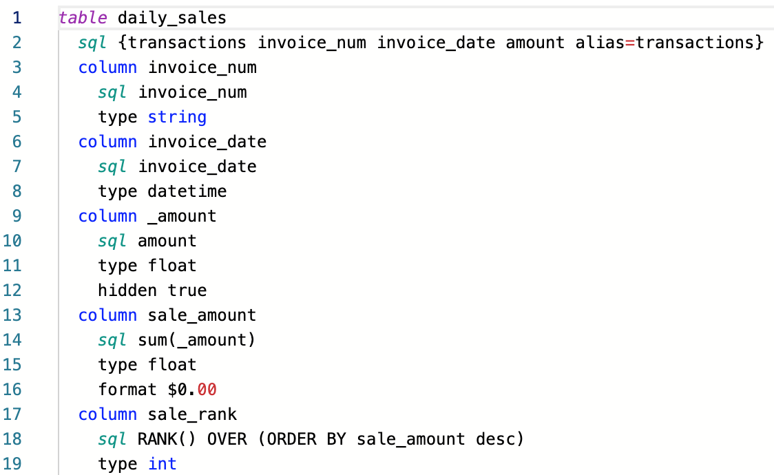 In the SQL, use three levels of nesting of SELECT statements. The country filter is applied at the innermost level. The daily_sales table is marked as a reftable rather than table in the retail dataset. This prevents the table from appearing in the data viewer’s list of tables.