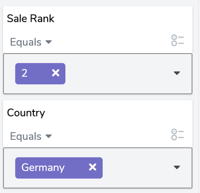 Set the filters using the Sale Rank from Daily Ranked Sales and Country from Transactions: